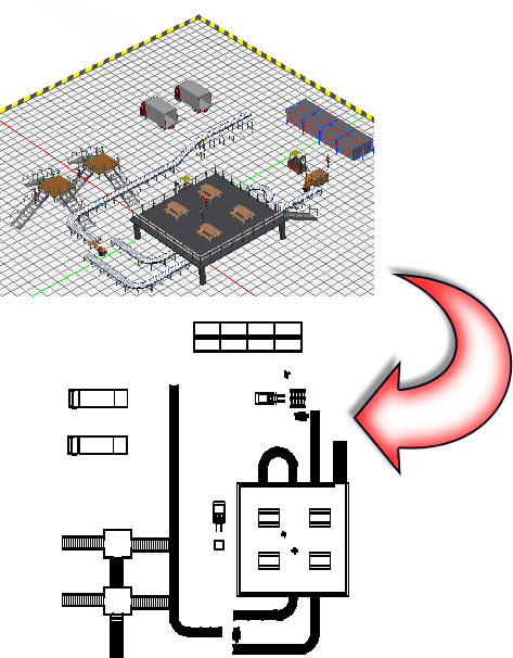 É possível salvar um layout de piso de fábrica 3D como um desenho 2D do AutoCAD a qualquer momento usando o comando Publicar/Atualizar DWG. Após a criação do desenho, você tem a opção de iniciar imediatamente o AutoCAD e abrir o desenho na janela de desenho do AutoCAD.