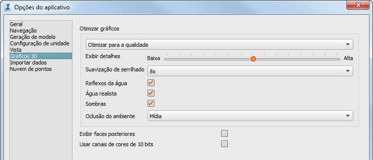 Controle a otimização dos gráficos e outras configurações em seu modelo, como o detalhe de exibição, anti-suavização de serrilhado, qualidade da oclusão de ambiente, sombras, reflexões de água, água realista e as opções de exibição da face traseira.