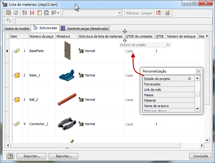 O valor Aparência do modelo é adicionado como uma propriedade que pode ser selecionada. É possível adicionar a propriedade Aparência a uma lista de materiais ou a uma lista de peças.