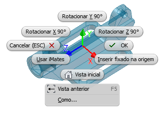 Uma nova opção do aplicativo de montagem especifica se deseja fixar o primeiro componente inserido na origem. Esta nova opção é desativada por padrão. Para fixar qualquer componente na origem, utilize o menu de contexto. O menu contém novas opções para rotacionar os componentes em incrementos de 90 graus em torno dos eixos X, Y ou Z antes de inseri-los na montagem.