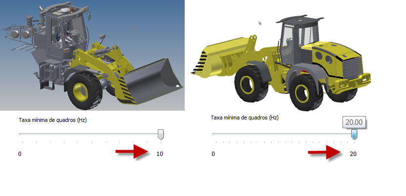 Nas imagens a seguir, o modelo 2013 à esquerda exibe os resultados de rotação do modelo utilizando o máximo de dez quadros por segundo. Aumentar a taxa de quadros aumenta a velocidade, mas a escolha dos componentes para desenhar não é inteligente. O modelo 2014 à direita exibe os resultados da rotação na taxa de quadros máxima mais rápida de 20 Hz. O modelo permanece reconhecível e todas as operações de vista são mais rápidas.