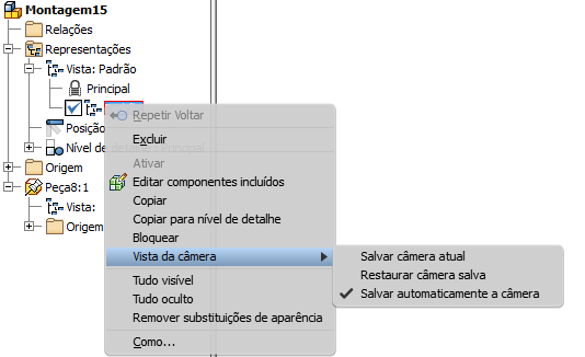 Em versões anteriores do Inventor, a posição da câmera é sempre salva automaticamente quando a representação da vista de projeto é fechada. Quando você rotaciona ou usa o zoom no modelo em uma vista de projeto, as ferramentas para restaurar as configurações anteriores da câmera são limitadas.