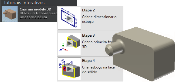 Um novo tutorial interativo sobre habilidades básicas orienta você pelos comandos e fluxos de trabalho para criação de objetos 3D no Inventor.