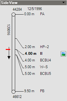 To the left of the section representation is an arrow which indicates flow direction. To the right of the section representation is a list of distances and corresponding damage codes. Double-clicking a damage code changes the description data shown in the Description section and also advances or rewinds the video to that location along the section. If an image icon is present, it means there is a still image associated with that observation point which you can view. Note: If multiple observations are within 2 meters of one another, double-clicking or moving the slider over one of the observations with auto-highlight or auto-zoom all the observations. This occurs only when Auto Highlight or Auto Zoom are active.