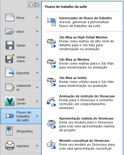 Dependendo da suíte, o produto de origem será o AutoCAD, o Inventor ou o Revit. O produto de destino é sempre o 3ds Max ou o Showcase. Os fluxos de trabalho fornecidos com uma suíte podem variar de acordo com o nível da suíte (standard, premium ou ultimate). Os usuários corporativos com licenças eFlex ou Term Multi-Flex têm autorização para utilizar qualquer um dos fluxos de trabalho.