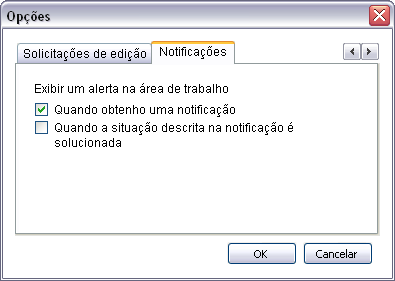 Selecione uma opção para indicar se deseja receber alertas na área de trabalho quando o Worksharing Monitor emite uma notificação ou indica que um problema foi solucionado. Desmarque uma opção para evitar receber alertas na área de trabalho.