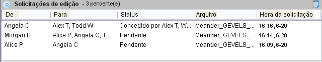 Quando a solicitação é concedida, negada ou retraída, suas informações são movidas para o histórico Solicitações de edição. Se a solicitação é enviada para múltiplos destinatários, esta é exibida no painel Solicitação de Edições, desde que não tenha sido completamente concedida e que nenhum dos destinatários a tenha negado.