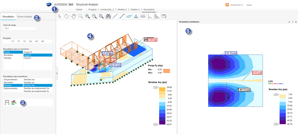 Explorar resultados detalhados. Ela exibe os valores extremos do tipo de resultado selecionado, os mapas (de elementos da superfície) e os diagramas (dos membros) de um elemento selecionado na vista 3D (4). Você também pode exibir os valores resultantes nos pontos que selecionar.