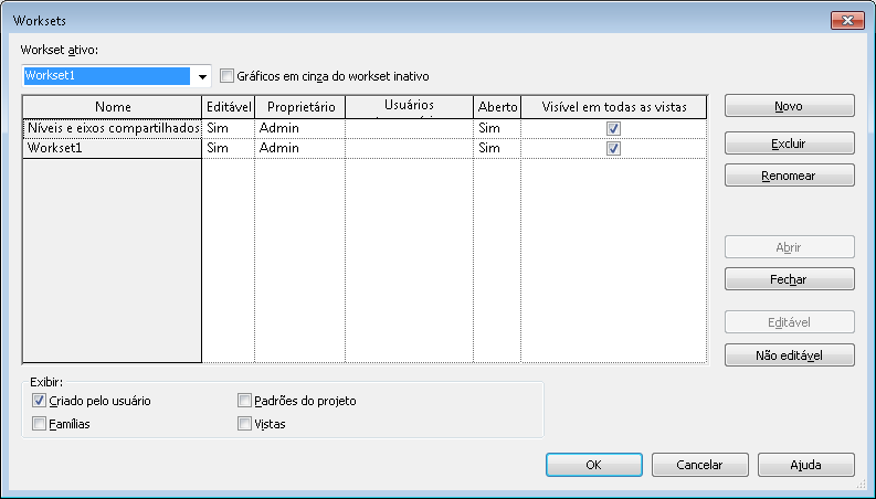 A imagem a seguir mostra a caixa de diálogo Worksets, como os dois worksets padrão do usuário criados, Níveis de compartilhamento e Grades e Workset1.