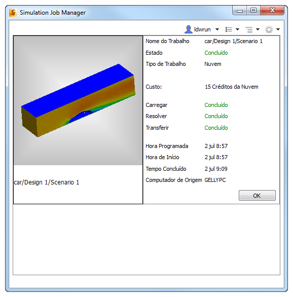 - Baixar: processo de copiar os dados dos resultados de simulação do serviço de armazenamento seguro do Autodesk 360 de volta para a estação de trabalho local. Quando a etapa Baixar alcança Concluído, a simulação é concluída e os resultados estão prontos para visualização no computador local. Observe que há momentos em que a etapa Baixar aparece com o status Em execução ao mesmo tempo que a etapa Solucionar. Isso acontece para permitir o download de resultados intermediários.