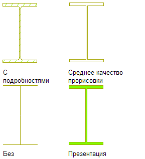 Разные уровни детализированности экранного представления несущего элемента: "План с подробностями", "План без подробностей", "План"