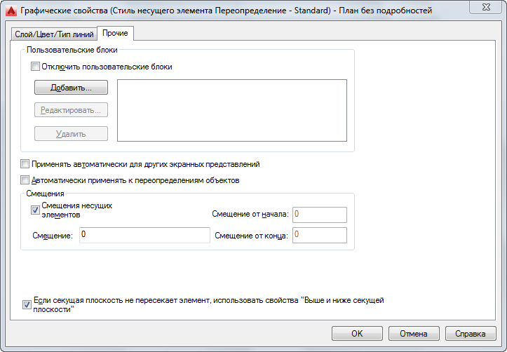В экранном представлении "План без подробностей" элемент отображается простыми линиями и дугами. Экранное представление можно использовать для построения схематического вида сверху, когда требуется изобразить колонну в виде одной линии. Экранное представление "План без подробностей" включает в себя два компонента: "Балка - усл. изоб." и "Раскос - усл. изоб." Чтобы изображения балок и раскосов были представлены на экране различным образом, можно изменить такие графические свойства этих компонент, как слой, цвет и тип линии. Чтобы отобразить элементы так, как это обычно бывает нужно на схематических видах сверху, можно добавить отступы между элементами, пользуясь для этого диалоговым окном переопределения стиля данного экранного представления на вкладке "Прочие". Помните, что флажок "Использовать смещения элементов" применяется только к смещениям начала и конца. Значение смещения под флажком применяется только к несущим раскосам и позволяет смещать их по горизонтали, так чтобы они были видны даже в тех случаях, когда они расположены прямо под балкой.