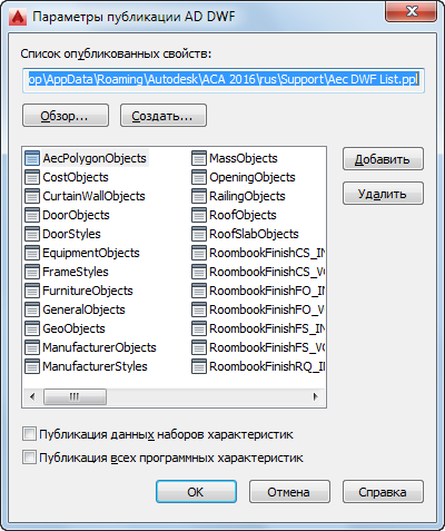В результате будут публиковаться все автоматически задаваемые свойства, связанные с объектами, выбранными для экспорта в DWF- или DWFx-файл.