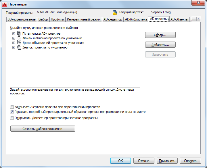 Эти настройки применяются при создании новых проектов без использования шаблонов. Если новый проект создается на основе шаблонного проекта, то вместо рассматриваемых здесь настроек используются настройки шаблонного проекта.