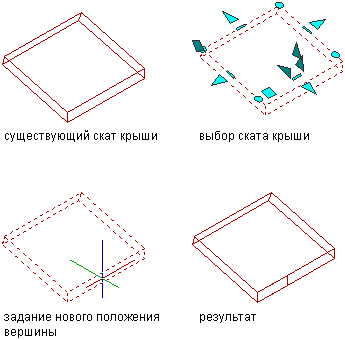 Эта процедура используется для добавления вершины на кромку перекрытия/ската крыши. При добавлении вершины из одной кромки перекрытия/ската крыши создаются две.
