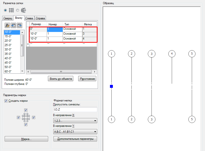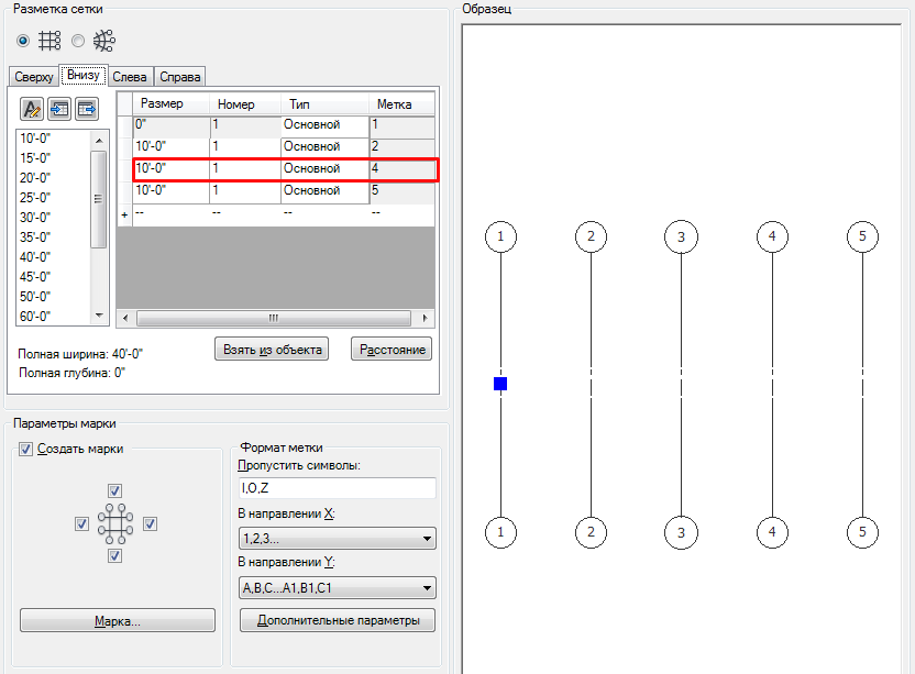 - Прежде всего сформируйте компоновку сетки для той стороны, которая содержит большее количество линий сетки. Например, если требуется создать сетку с линиями 1, 2, 3, 4, 5 сверху и 1, 3, 4, 5 снизу, вначале перейдите на вкладку "Сверху" и сформируйте четыре пролета на требуемом расстоянии.