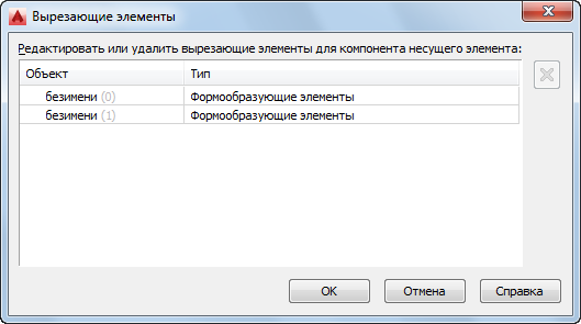 Прим.: Это диалоговое окно также используется для удаления вырезающего элемента посредством нажатия правой кнопки мыши на ячейке "Объект" или "Тип" и выбора "Удалить". Альтернативный способ - использование контекстного меню несущего элемента. При удалении вырезающего элемента происходит удаление связи несущего элемента с объектом, который использовался для создания этого элемента. Сам объект не удаляется из чертежа.