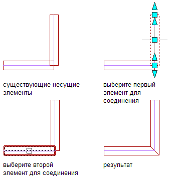 Прим.: Если значение автоматической обрезки (на палитре свойств) установлено в положение "Да" для каждого из связанных несущих элементов, то применение любого вида ручки редактирования к любому элементу приведет к образованию углового соединения между ними.