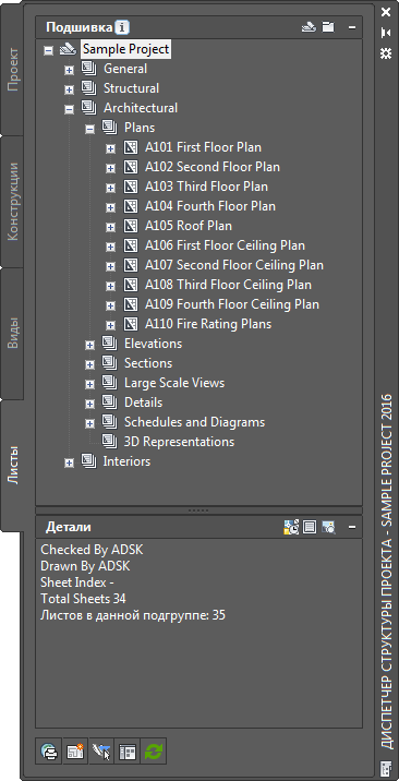 Списки подшивок, листов, видов листов, чертежей с листами и видов пространства модели приведены на вкладках "Листы" и "Виды" Диспетчера структуры проекта.