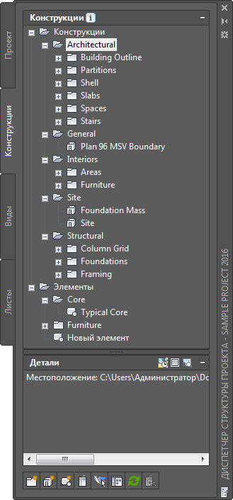 Для облегчения организации структуры здания компоненты проекта здания, такие как конструкции, виды и листы, можно разбить на категории. Можно использовать такие категории, как оболочка, каркас и внутренние перегородки. Отнесение конструкции к некоторой категории позволяет выполнять фильтрацию при формировании видов.
