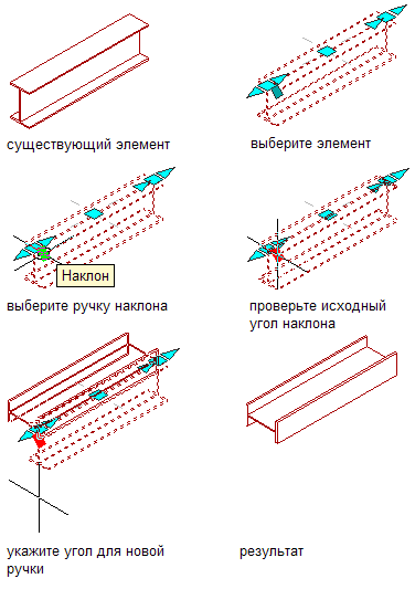 Эта процедура используется для изменения угла поворота несущего элемента относительно его оси выдавливания путем задания угла поворота в градусах. Положительное значение соответствует повороту элемента против часовой стрелки, если смотреть от его конца к началу.