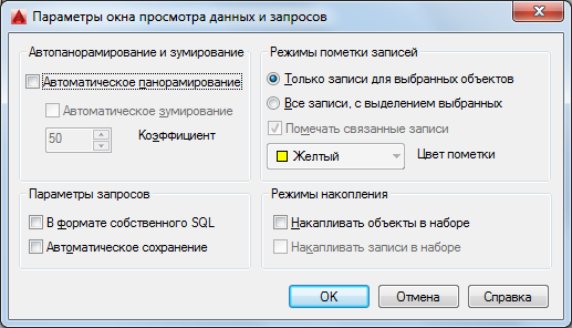 Для задания различных режимов просмотра связанных графических объектов и записей используется диалоговое окно "Параметры окна просмотра данных и запросов".
