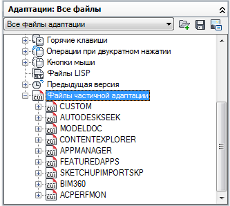 На этой панели можно создавать и изменять элементы пользовательского интерфейса, например панелей и вкладок ленты и панелей "Быстрый доступ". Вверху панели находятся инструменты, позволяющие загружать файлы частичной адаптации в основной файл адаптации, сохранять изменения в загруженных файлах адаптации и управлять способами отображения загруженных файлов адаптации.