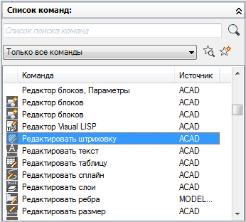В верхней части панели "Список команд" находится поле "Список поиска команд", с помощью которого можно фильтровать список команд по введенной текстовой строке. Команда отображается в поле списка команд в том случае, если какой-либо фрагмент этой команды совпадает с введенной строкой.