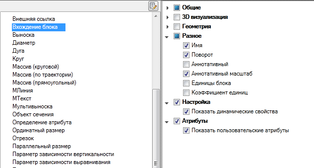 Если в категориях "Пользовательские" и "Атрибуты" установлены флажки, динамические свойства и атрибуты блока отображаются в палитре "Быстрые свойства".
