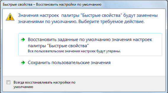 Восстановление используемых по умолчанию параметров быстрых свойств