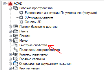 - На панели "Свойства" выберите свойства, которые требуется отображать в палитре "Быстрые свойства" для объектов данного типа.