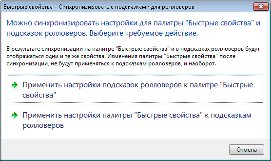 - Щелкните "Применить настройки подсказок ролловеров к палитре "Быстрые свойства"".