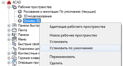Нажатием правой кнопки мыши выберите рабочее пространство, которое необходимо установить по умолчанию. Нажмите кнопку "Установить по умолчанию".