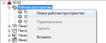 На вкладке "Адаптация" панели "Адаптации: <имя файла>" щелкните правой кнопкой мыши узел "Рабочие пространства" и выберите "Новое рабочее пространство".