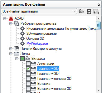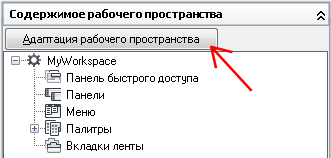На вкладке "Адаптация" разверните на панели "Адаптации <имя файла>" узел "Рабочие пространства", щелкнув на знаке "плюс" (+) рядом с этим узлом.