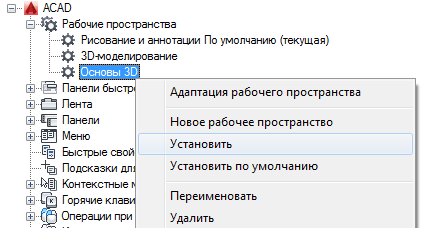 Нажатием правой кнопки мыши выберите рабочее пространство, которое необходимо установить как текущее. Выберите "Установить".