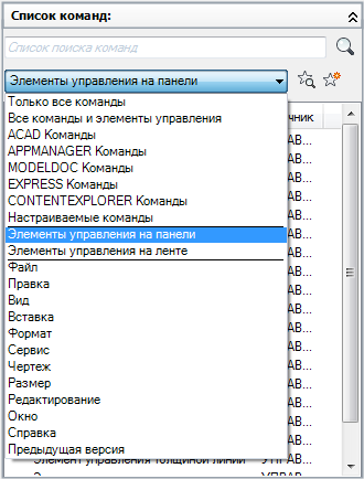 На панели "Список команд" отображается только список элементов управления панели инструментов.