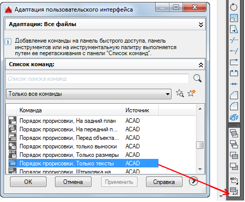 - Перетащите команду, которую требуется добавить, с панели "Список команд" на нужную панель инструментов, которая находится на панели "Адаптации <имя файла>".