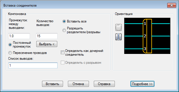 Инструмент "Вставить соединитель" формирует графический образ соединителя на основе пользовательских параметров. Графический образ создается "на ходу" и вставляется как блок в файл активного чертежа. Так как создание выполняется по мере необходимости, не требуется непременное создание и хранение библиотеки графических образов соединителей.