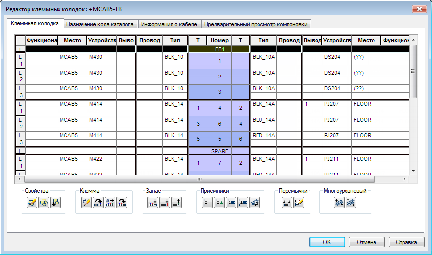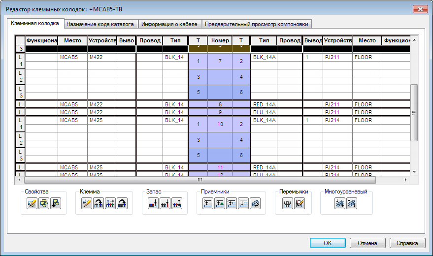 Для управления клеммами, редактирования свойств клемм, соединения клемм и вставки графической клеммной колодки служит редактор клеммных колодок.