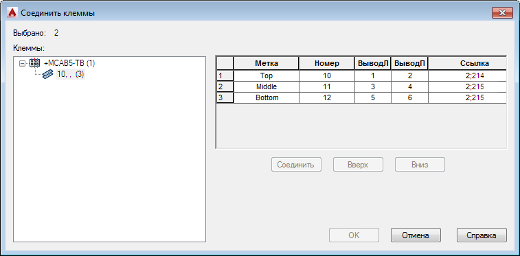 Прим.: Для перемещения клеммы 1 в верхнюю строку таблицы также можно использовать инструмент "Вверх".