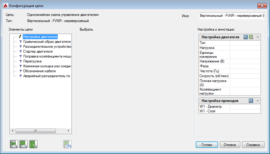 Использование конструктора цепей для вставки однолинейной цепи управления двигателем и размера провода на основе отраслевых стандартов.