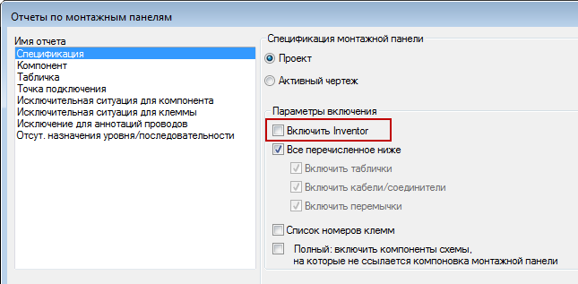 Если проект связан со сборкой Inventor как часть электромеханического проекта, можно создать составной отчет по спецификации. При создании отчета по спецификации монтажной панели доступна возможность включить детали Inventor.
