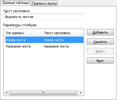Вкладка "Данные таблицы" (диалоговое окно "Ведомость листов")