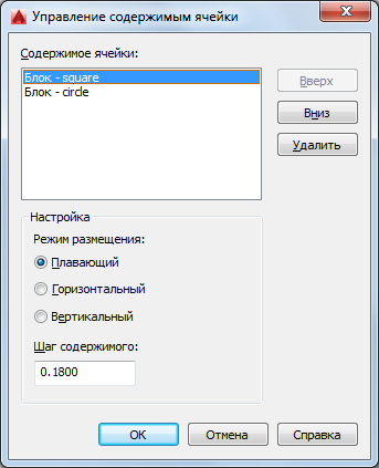 Вывод списка всех элементов текста и/или блоков в выбранной ячейки в порядке их отображения. Текст обозначен меткой "Текст ячейки таблицы". Блоки обозначены метками, состоящими из префикса "Блок" и имени блока.