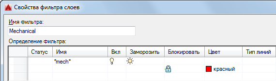 Отображение свойств слоев, в соответствии с которыми будет отображаться список слоев. Для задания фильтра можно выбрать одно или несколько свойств. Если свойства заданы в одной строке определения фильтра, то для отображения имени слоя требуются все свойства (логическое "И"). Если свойства заданы в нескольких строках определения фильтра, то каждое из них является альтернативным критерием (логическое "ИЛИ").