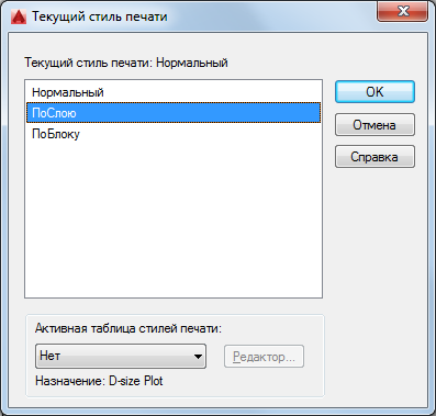 Список стилей печати, доступных для назначения объектам. Среди них стандартный стиль ОБЫЧНЫЙ. Стиль печати представляет собой совокупность переопределений для цвета, размывания, оттенков серого, присвоений перьев, интенсивности, типа и веса линий, торцов и соединений, способа заливки.