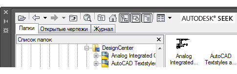 Для получения доступа к компонентам можно использовать вкладки "Папки", "Открыть чертежи" и "Журнал", а также кнопку Autodesk Seek в правом верхнем углу.