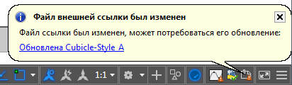 По умолчанию при изменении файла, на который есть ссылка, рядом со значком внешней ссылки в правом нижнем углу окна приложения (в строке состояния) появляется всплывающее уведомление. Необходимо нажать ссылку в уведомлении, чтобы обновить все изменившиеся внешние ссылки.