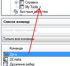 3. В панели "Список команд" перетащите команду в раскрывающееся меню или местоположение в раскрывающемся меню на панели "Адаптации в <имя файла>".